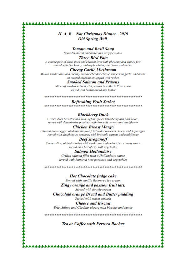 The H A B N-C-Dinner is on Sat 9th Feb. There are still places available. See the attached detail and menu .. send Richard £25 and your choices to Mike Fourie by end Jan……